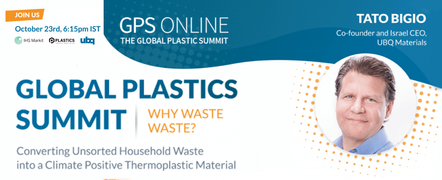 Tato Bigio, co-founder of UBQ and CEO of UBQ Israel, will be speaking about UBQ Materials’ groundbreaking process and technology on October 23rd at 11:15 a.m. EST. Join us for a talk titled “Why waste waste? Converting unsorted household waste into a climate-positive thermoplastic material”.